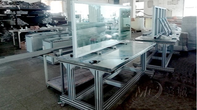 鋁板鏡面工作臺 由鋁型材及鋁型角碼組裝而成,臺面可配防靜電臺面或鋁合金臺面。外形美觀,整體拆裝簡易,結構堅固被廣泛用于車間生產組裝,檢驗、測試等。其常用鋁型材規格有40*40、40*60、50*50等,也可根據不同需求選配不同材料制作。